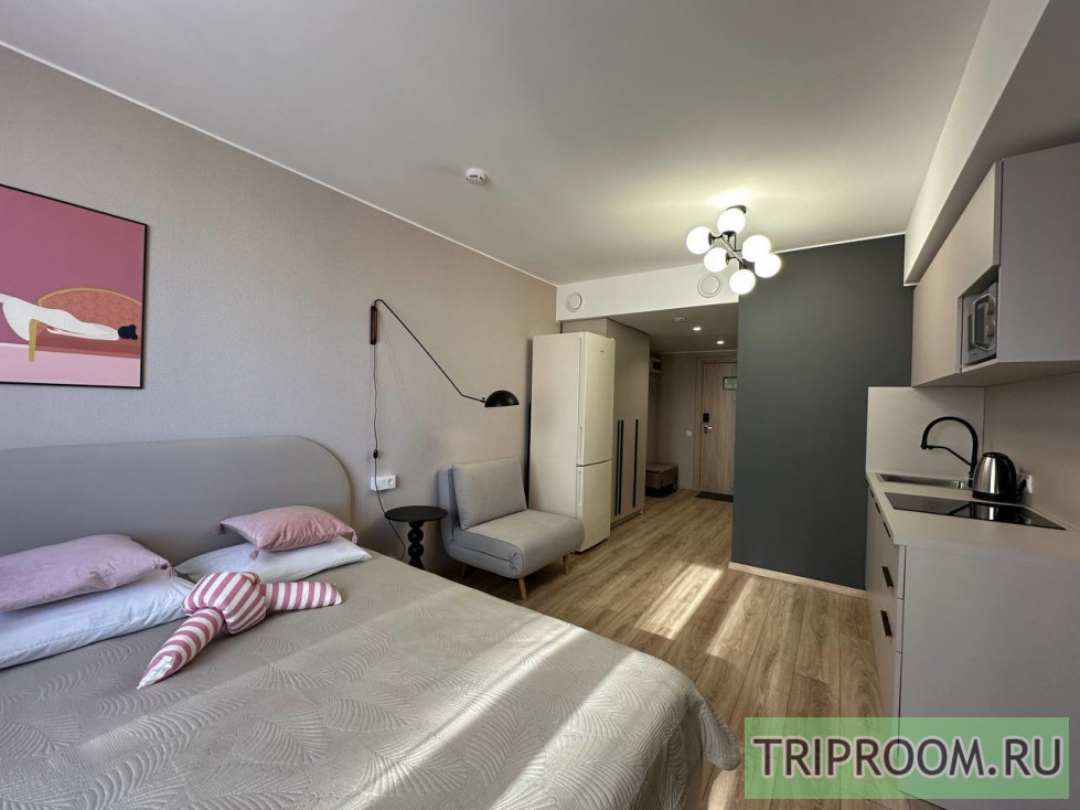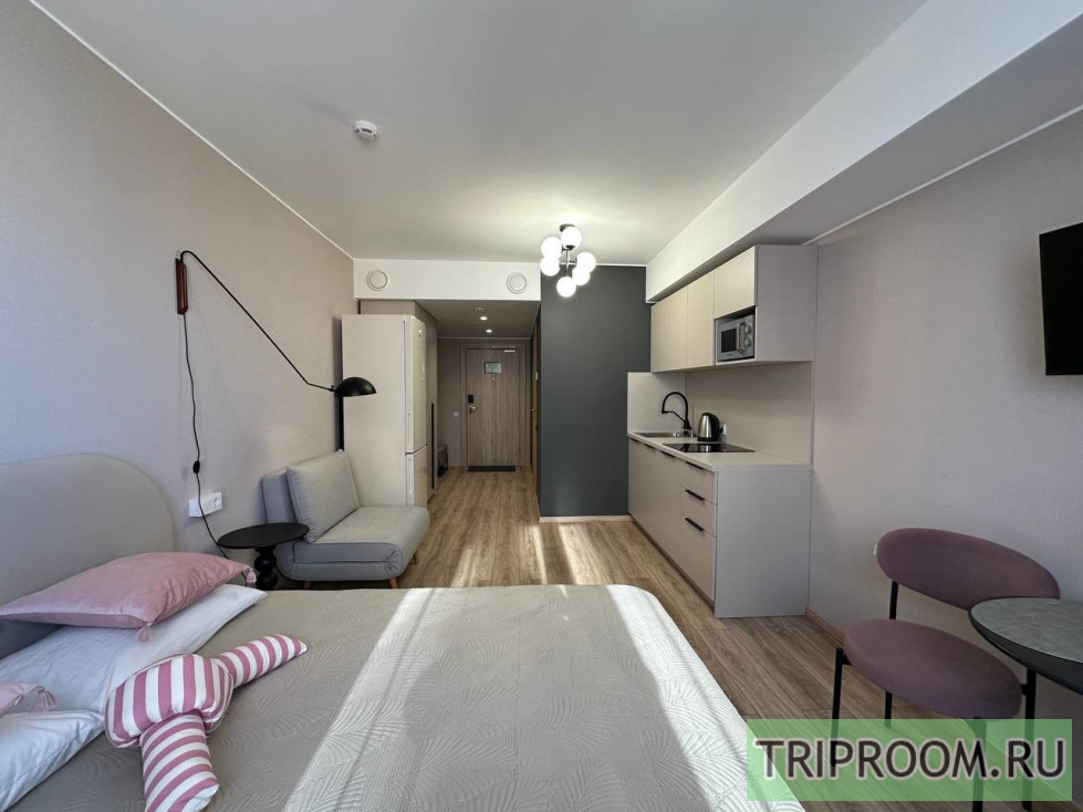 В доме имеется лифт, поэтому подъём на этаж не доставит неудобств даже с багажом. Планировка студии продумана до мелочей: пространство грамотно зонировано на спальную, гостиную и кухонную зоны.