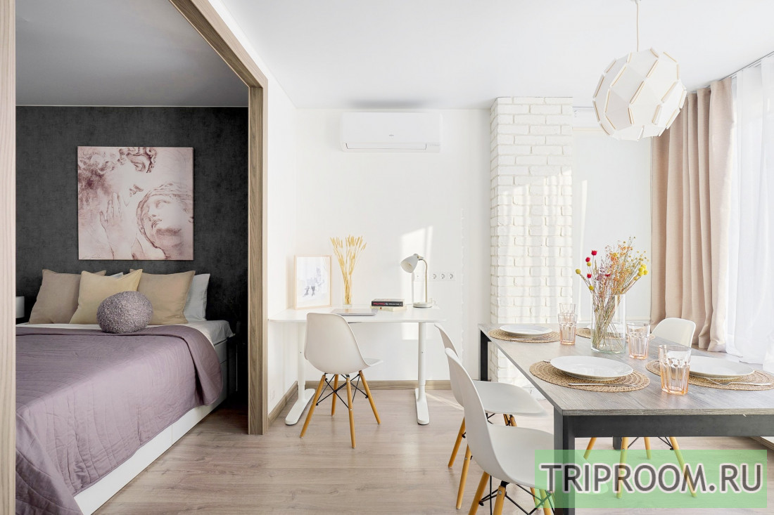 Удобные спальные места. В апартах приятно находиться, много воздуха и света, вдохновляющая атмосфера продуманного стильного дизайна, есть застекленная лоджия.